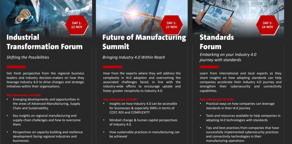 Accompanying these conferences are Digital Sandboxes driven by communities in the advanced manufacturing sector, aimed at directing conversations and debates to address challenge statements and explore practical solutions in adopting i4.0 progressively. Singapore-based participants can also partake in physical bolt-on activities, i.e. face-to-face engagement tours to locations in Singapore exemplifying some of the best industrial transformation showcases and deployment concepts for Industry 4.0. The in-person activities will also be streamed concurrently